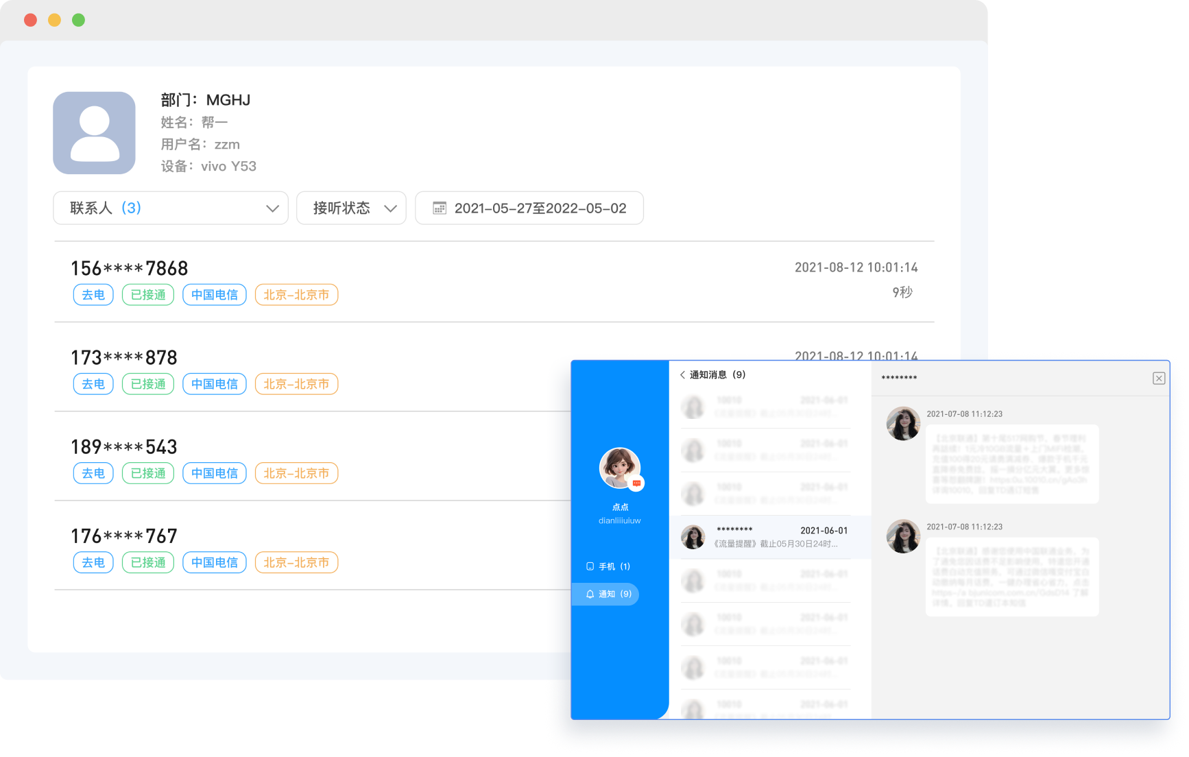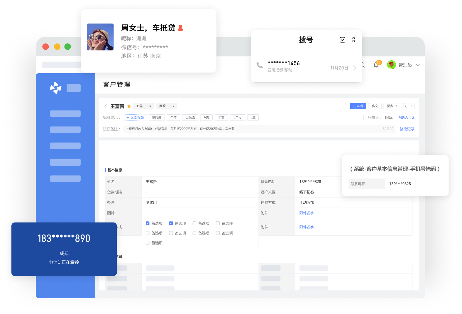 保护客户隐私,全渠道(电话/微信/短信)及终端(PC/移动)信息加密处理,形成闭环。
