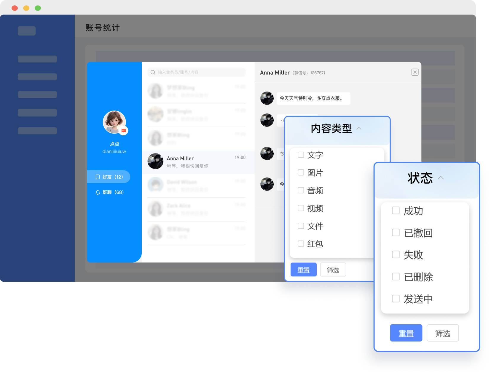 根据沟通过程中发生的行为进行预警(比如触发交易、触发敏感词、删除客户等),方便管理员进行实时干预